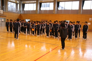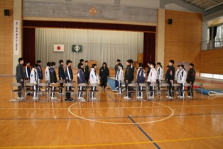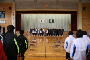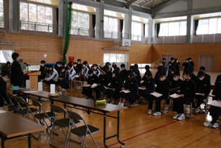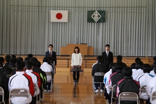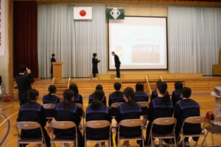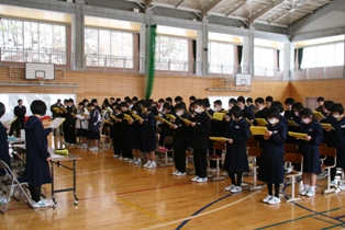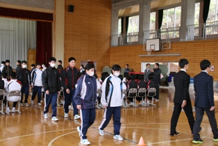 立居振舞など姿勢、礼法の確認をしてから、式の流れで練習を実施しました。中学校最大の儀式的行事ということもあり、緊張感のある練習となりました。特に3年生の姿勢が大変立派で、感動の卒業式にしたいという思いを感じました。