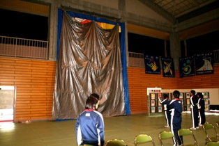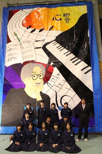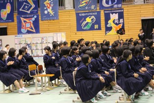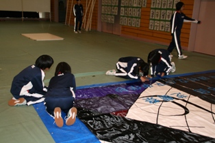 体育館に飾られた45枚の歴史あるろうけつ染めに、46枚目が飾られ披露されたときは感動に包まれました。小平中の伝統と歴史が語られているような瞬間でした。