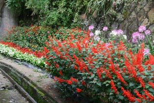 (校舎前や通学路、体育館脇に植えられた花々)