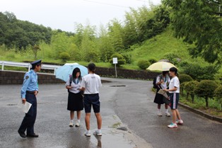 7月18日(金)、1学期終業式の朝、事件・事故防止のために平田駐在所駐在員と本校生徒会役員、規律交安委員会の生徒によるチラシ配付が行われました。