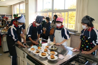 1年生の家庭科で調理実習が行われました。今回の実習は、洋食にチャレンジしました。多少ハプニングはありましたが、みんな大好きなハンバーガーを作るとあって、楽しく実習ができ、おいしく食べることができました。デザートの豆乳プリンも上手にできました。今後は、和食や郷土料理などにも挑戦するようです。