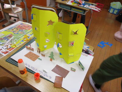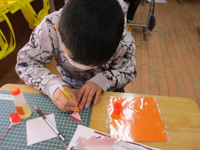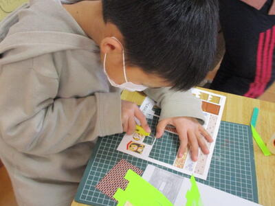 2年生の図工の様子です。カッターやはさみを使って、工作を行っていました。特に、カッターの使い方を安全に使えることが学習のねらいです。子どもたちは、様々な形を切り抜いたり、貼ったりしながら思い思いの作品を楽しそうに作っていました。