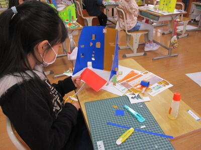2022年3月7日 15時32分2年生の図工の様子です。カッターやはさみを使って、工作を行っていました。特に、カッターの使い方を安全に使えることが学習のねらいです。子どもたちは、様々な形を切り抜いたり、貼ったりしながら思い思いの作品を楽しそうに作っていました。