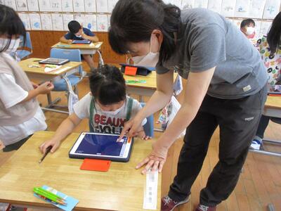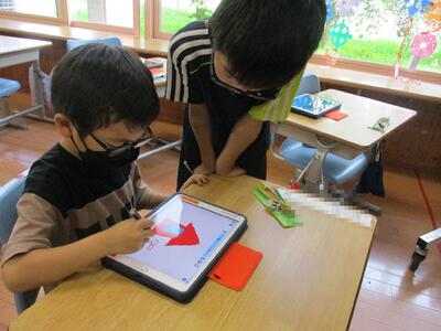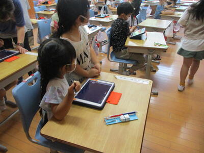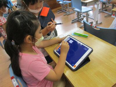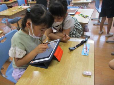 2022年7月15日 10時37分13日(水)、1年生がタブレットを使った活動をしていました。タブレットを使って思い思いの絵を描きました。そして、自分で描いた絵を、タブレット内の「提出箱」にドラッグ&ドロップすると、先生のタブレットに送られます。送られた絵は、教室前方の大型モニターに表示されました。子ども達がうれしそうに「(自分の絵が)届いた」と言う声がたくさん聞かれました。