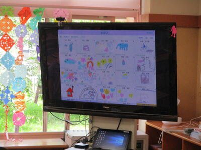 13日(水)、1年生がタブレットを使った活動をしていました。タブレットを使って思い思いの絵を描きました。そして、自分で描いた絵を、タブレット内の「提出箱」にドラッグ&ドロップすると、先生のタブレットに送られます。送られた絵は、教室前方の大型モニターに表示されました。子ども達がうれしそうに「(自分の絵が)届いた」と言う声がたくさん聞かれました。