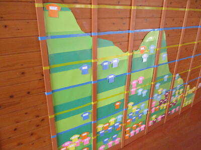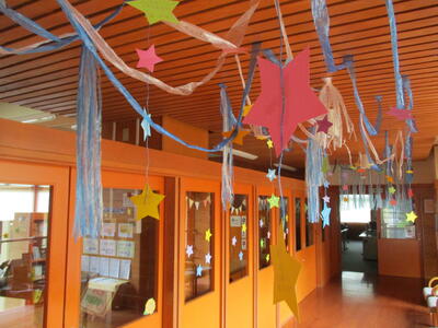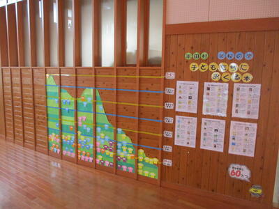 子ども達の読書への取組の様子は、多目的ホールの掲示「読書登山」で見えるようになっており、子ども達の励みとなっています。また、毎月、学校図書館は、学校司書の先生のおかげで読書に親しむ環境整備がされています。