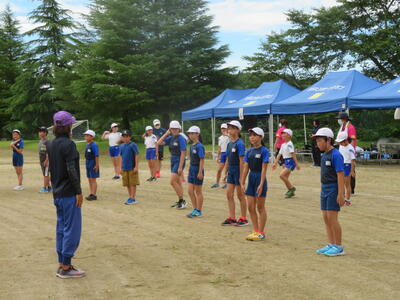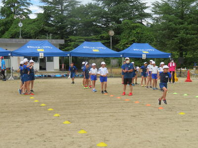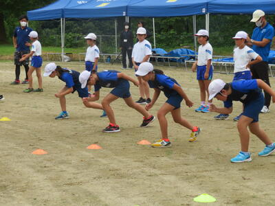 子ども達は、先生方から速く走るための指導を受けました。6年生は秋に陸上競技大会があります。それに向けて貴重な体験をすることができました。