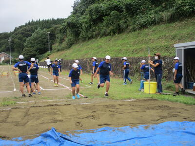 現在校庭の水たまりの水をスポンジでとっているところです。少しでもよいコンディションで行いますので、よろしくお願いします。