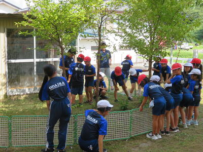 2年生は6年生にえさのあげかたなどを教えてもらい、一人一人えさやりを体験しました。みんなかわいいと大喜びでした。
