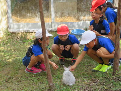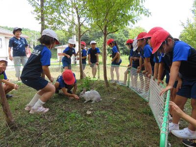 2023年8月29日 14時07分 昼休みに、うさぎにえさをあげたりするふれあい体験をしています。本日は6年生と2年生です。