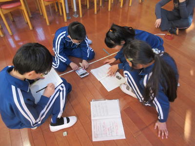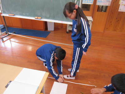 このような手順で、1人1人の歩幅の長さを求めていきました。1人では活動することができないでの、グループで力を合わせて取り組む姿が見られました。平均を求めるために、メジャーの目盛りの読み方、㎝からmの単位にする仕方など下の学年で学習してきたことを、活用して考えなければならないので、よい復習の時間にもなりました。うまくできないグループもありましたが、失敗から学ぶことも多いので、次に生かしてほしいと思います。