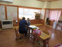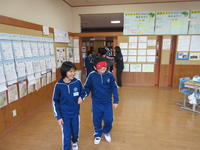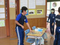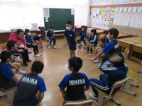 そこで、介護をする人の手助けを体験しました。「進みますよ」「止まります」「ここが椅子の背もたれですよ」「これが机ですよ」など声をかけながら介護を行います。そうすることによって、介護される人へ安心感を与えることができます。子どもたちも、一人で歩くよりもスムーズにできることを実感したようです。