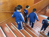 昨日、4年生が総合的な学習の時間を活用して、「介護ってなんだろう?~介護する側、介護される側の体験をしてみよう~」というテーマで二本松市にある専門学校から先生をお招きし出前授業を行いました。今回は、アイマスクを着用しての歩行体験や白杖を使っての歩行体験を行いました。
