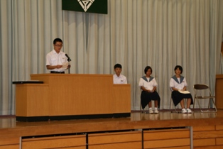 各学年代表、生徒会執行部の代表生徒による発表では、夏休みの成果,2学期の目標や取り組み等について発表がありました。それぞれ、堂々と発表する姿はとても立派でした。