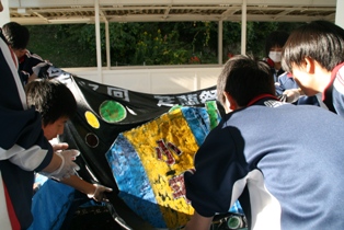 (会場係:体育館前に立てる看板の仕上げを行いました)