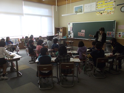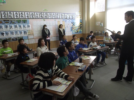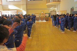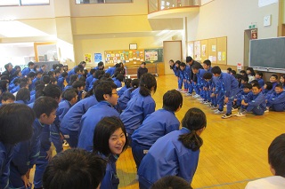 2014年12月12日 08時03分 12月8日(月)の発表集会では、4年生の外国語発表が行われました。蓬田小学校では、全校集会以外に発表集会を行っています。発表集会では、各学年年間2回の発表を行いますが、その2回のうち1回は外国語活動の発表を行うようにしています。外国語活動は、5年生と6年生が授業として行っていますが、1年生から4年生も国際理解教育の一環として取り組んでいます。発表集会では、各学年の発達段階に応じた発表が見られ、全校生で楽しんでいます。今回は、あの有名な「サイモン セッズ~!!」で、盛り上がりました。