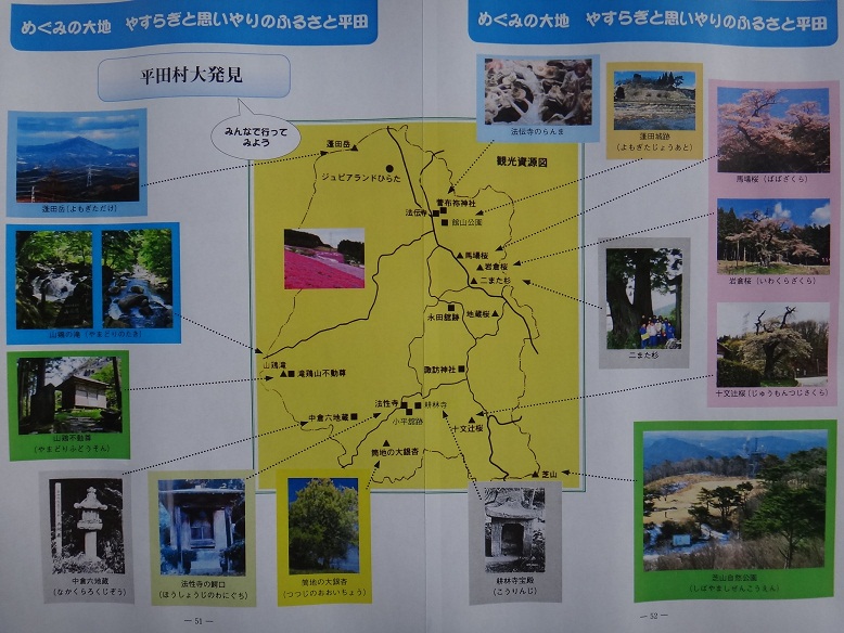 ①蓬田岳 ②ジュピアランド ③芝山 ④山鶏の滝 ⑤道の駅ひらた ⑥中央公民館