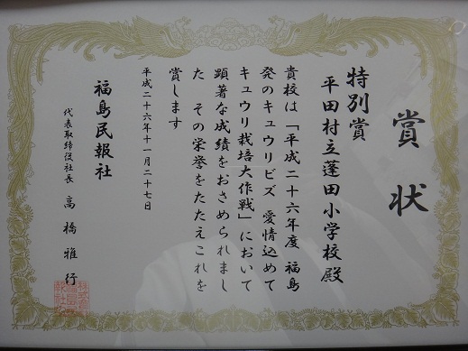 ☆福島発の「キュウリビズ」愛情込めてキュウリ栽培大作戦・・・特別賞(第4学年)