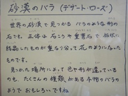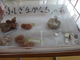 2014年11月20日 13時44分 お楽しみ博物館の第4弾!!今回の展示は「ふしぎな形をした石」です!!とても自然にできた天然の石とは思えない形をしています。世界には、こんなおもしろい形の石があるんですね。特に◇の石は、機械で切断したり、形を四角に整えたりしていないというのが本当に驚きです。ぜひ、横から斜めから、じっくり眺めてみることをお勧めします。