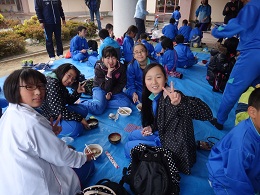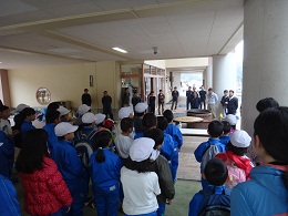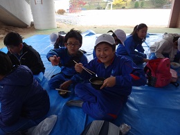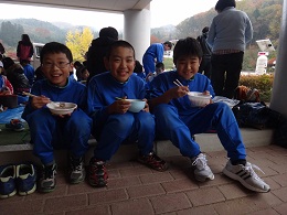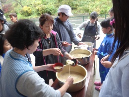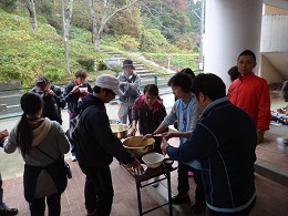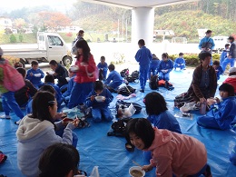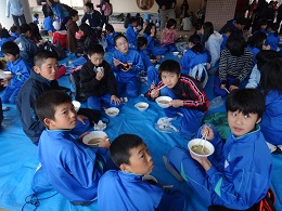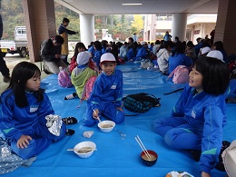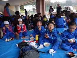 11月1日(土)には、蓬田岳登山を行う予定でしたが、当日朝の急な降雨により、残念ながら登山は中止となってしまいました。せめて豚汁だけでも子ども達に味わわせたいというPTA役員の方々の思いから、学校で豚汁会を行うことになりました。参加者の方々には、急な変更でご迷惑をおかけしましたが、結果的には、みんなでおいしい豚汁を食べることができ、よかったと思います。子ども達は、ビデオ鑑賞したりフェスティバルの準備をしたりで待ち時間を過ごしましたが、豚汁が完成すると「おいしい!おいしい!」と言って、何杯もおかわりをする姿が見られました。