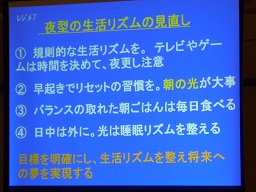 11月12日(水)には、蓬田小学校を会場として、平田村地域学校保健委員会が行われました。保護者の方々にも参加していただき、「子どもの健康と生活習慣」をテーマに、早寝・早起き・朝ご飯について考えました。講演会では、「睡眠リズムと生活習慣」と題して、日本睡眠学会・理学博士から睡眠の大切さについて貴重なお話をきくことができました。
