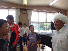 ビリー先生とのあいさつ 音楽に合わせて体を触ります・・・