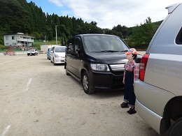 車の陰に立つ子ども(人形)が・・・ 反対側からお母さんに呼ばれる想定