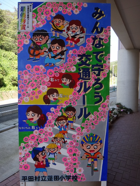 2014年9月24日 11時26分 先日行われた第35回交通安全立看板コンクールにおいて、蓬田小学校が制作した立看板が見事「最優秀賞」を受賞しました。毎年、自転車部の活動として制作に取り組んでいる看板作りですが、自転車部だけの成果としてではなく、蓬田小学校全員の思いが込められた作品として、保護者の方々にも見てほしいと思います。毎日眺めることができる玄関前に設置してありますので、「交通安全」の意識をさらに高めるシンボルとして、子ども達には見てほしいと思います。