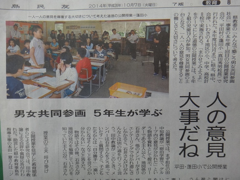 2014年9月26日 17時38分 9月26日(金)には、福島県教育委員会主催による、「みんなで築こう男女共同参画社会」事業の公開授業研究会が蓬田小学校で行われました。この事業の指定を受け、本校では5年2組が代表として道徳の授業を発表しました。「まかせてみようよ」という資料をもとに、男女共同参画の土台となる、一人一人の意見を尊重することの難しさと大切さについて考えることができました。
