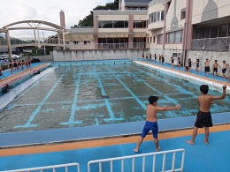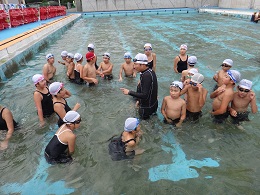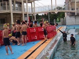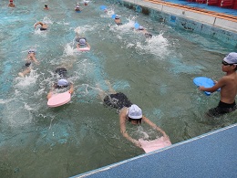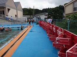 2014年9月5日 13時57分 9月5日(金)には、今年度最後の水泳学習が行われました。連日の曇り空で、水泳学習最終日も諦めていましたが、昼頃、久しぶりに太陽が顔を覗かせ、5校時目に5・6年生がプールに入ることができました。水温は若干低めでしたが、久しぶりの水泳学習に歓喜の声が響き渡りました。最後に、低学年用の補助台やコースロープなどを片付けて、今年度の水泳学習が終了となりました。