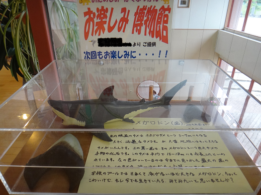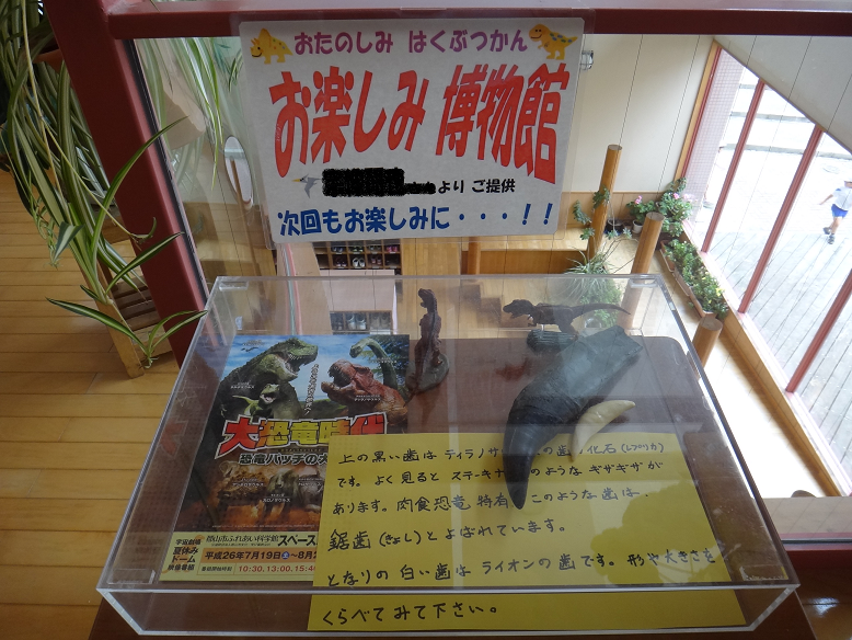 2014年9月10日 15時42分 蓬田小学校の保護者の御厚意で、恐竜の骨や模型など、子ども達が興味をもちそうな貴重な資料をご提供いただいています。昨年度は、6年生を中心に歴史的な遺物などを見せていただきましたが、今年度も蓬田小学校の子ども達のために、資料をお持ちいただきました。2階廊下に「お楽しみ博物館」として展示していますが、特に、男の子は興味津々の様子です。