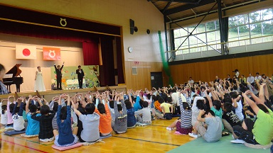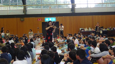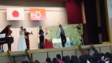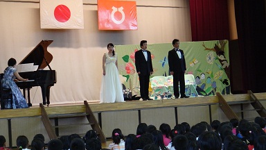 2014年9月17日 17時57分 9月18日(水)には、村勤労者体育センターにおいて「ビバ!ムジカ!喜びの歌を歌おう」家庭劇場が行われました。蓬田小学校と小平小学校の児童にとって、プロのオペラ歌手による声量豊かな生の歌声を聞く、貴重な機会となりました。「千の風になって」など誰もが知っている曲から、「電話」など形態模写を取り入れた愉快な曲、そして最近取り組み始めたという邦楽「八木節」。歌の合間には、バイオリンによる楽しい演奏を聞かせていただくなど、子ども達が最後まで興味深く鑑賞することができました。美しい演奏に触れることで、音楽のすばらしさを感じ取ることができた素敵な家庭劇場となりました