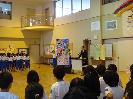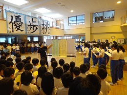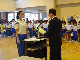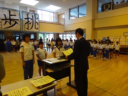2014年9月1日 14時50分 本日より9月となりました。早いもので、前期もいよいよ最終月となります。今日の全校集会では、各スポーツ少年団や習字関係など、蓬田小児童の活躍について、たくさんの表彰を行いました。また、作成中の交通安全看板を見ながら、交通事故防止について、実際に看板に書かれていることが実践できるよう、全校生で確認し合いました。