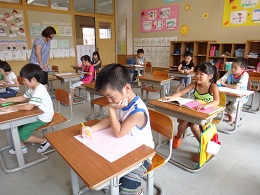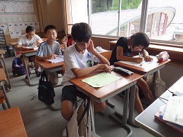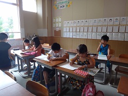 2014年8月22日 09時54分 8月22日(金)には、夏休み最後の寺子屋(夏季補習)が行われました。夏休み中に、計5回行われた夏季補習ですが、1学期の復習や夏休み中の課題について、担任からアドバイスをもらいながら課題に取り組みました。子ども達は、それぞれの目標に向かって、1時間集中して課題に取り組む意欲的な姿が見られました。