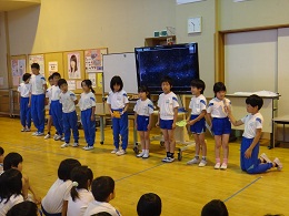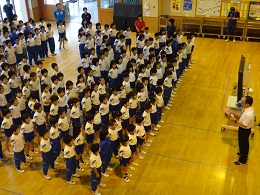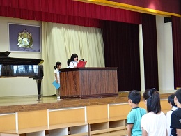 終業式では、1学期を振り返っての反省を2年生、4年生、6年生の代表児童が立派に述べることができました。 代表児童だけでなく、全校生が自分の反省を生かし、夏休みを有意義に過ごしてほしいと思います。