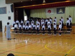 2014年7月18日 13時25分 7月18日(金)には、合唱部の壮行会が行われました。今年度の地区小中学校音楽祭は、8月20日に行われるので、1学期終業式後の壮行会実施となりました。例年、夏休みに集中して練習し、2学期始業式での発表でしたが・・・まだ完全に仕上がっていないのにもかかわらず、とても素晴らしい歌声に全校生が感動させられました。本番まで練習を積み重ね、大会当日は、さらに素敵な歌声を披露することができることを願っています。
