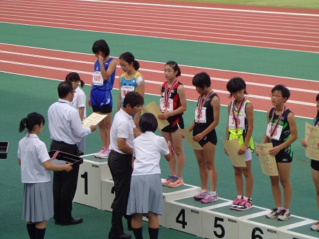 2014年7月6日 14時53分 7月6日(日)には、福島市の「とうほうみんなのスタジアム」において、全国小学生陸上競技交流会福島県選考会が行われました。6月の地区予選会で勝ち残った7名の選手達が参加し、それぞれの種目で全力で頑張る姿が見られました。この大会は、県内各地区から選ばれた選手のみが参加するので、レベルの高い争いでの競技となりました。本校でも、女子100m走で、見事3位に入賞することができ、素晴らしい成績に参加者全員が大喜びしました。