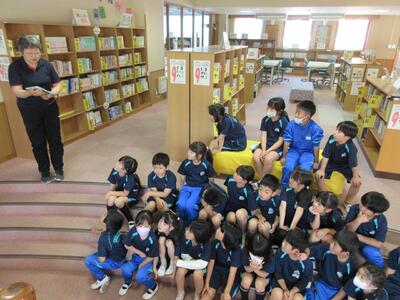 2024年6月3日 16時31分学校司書の先生に読み聞かせをしてもらっている2年生。本校図書室の近くには,階段状になっているすてきなスペースがあります。
