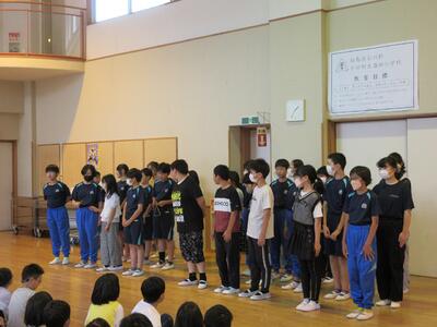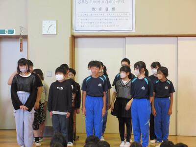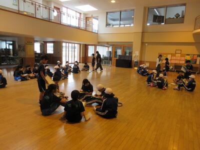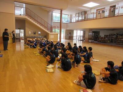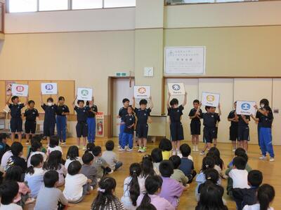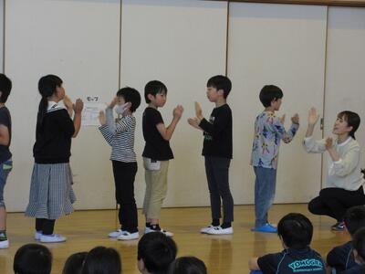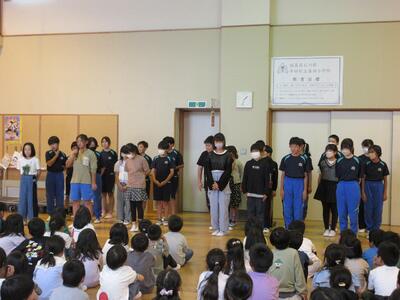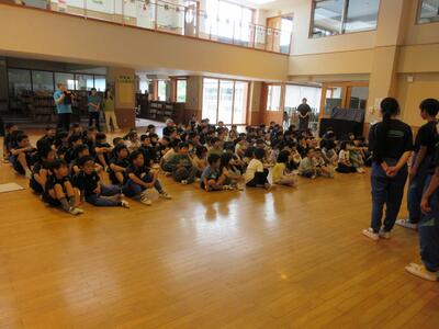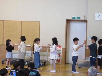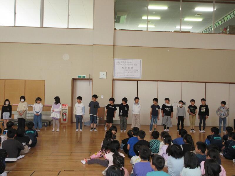 2024年6月3日 16時34分今日の全校集会は、発表集会です。2年生が英語の歌「BINGO]を,3年生が音楽科で学習した「茶つみ」を楽しく発表しました。